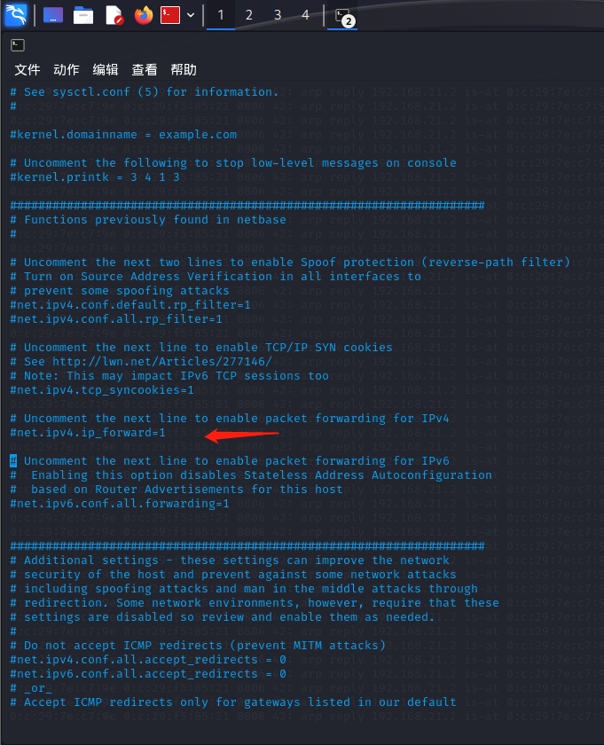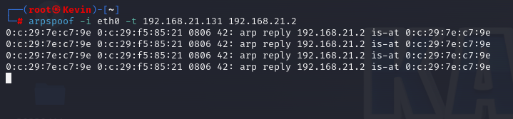 然后我们输入arpspoof -i eth0 -t 192.168.21.131 192.168.21.2