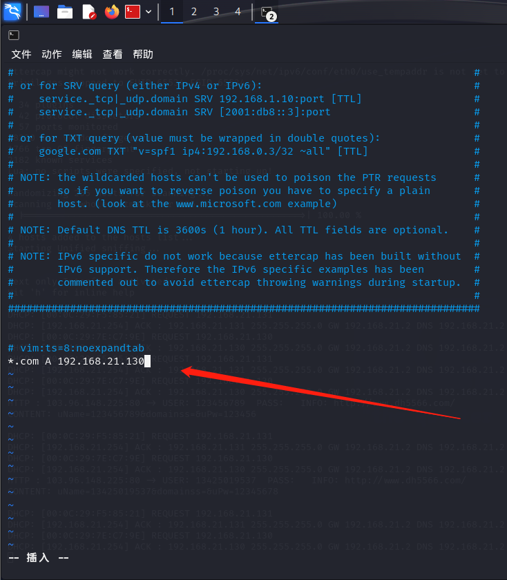 1. 首先打开ettercap的DNS文件进行编辑,在kali linux2.0下的文件路径为/etc/ettercap/etter.dns,打开命令行,输入vim /etc/ettercap/etter.dns,在后面加上*.com A 192.168.21.130 ,保存退出