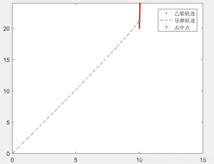 结论: 上图为结果 以乙船速度V 为 单位1 计算 经过 1.1713 后被击中 被击中时的坐标点为 (10.0147 ,21.1712)