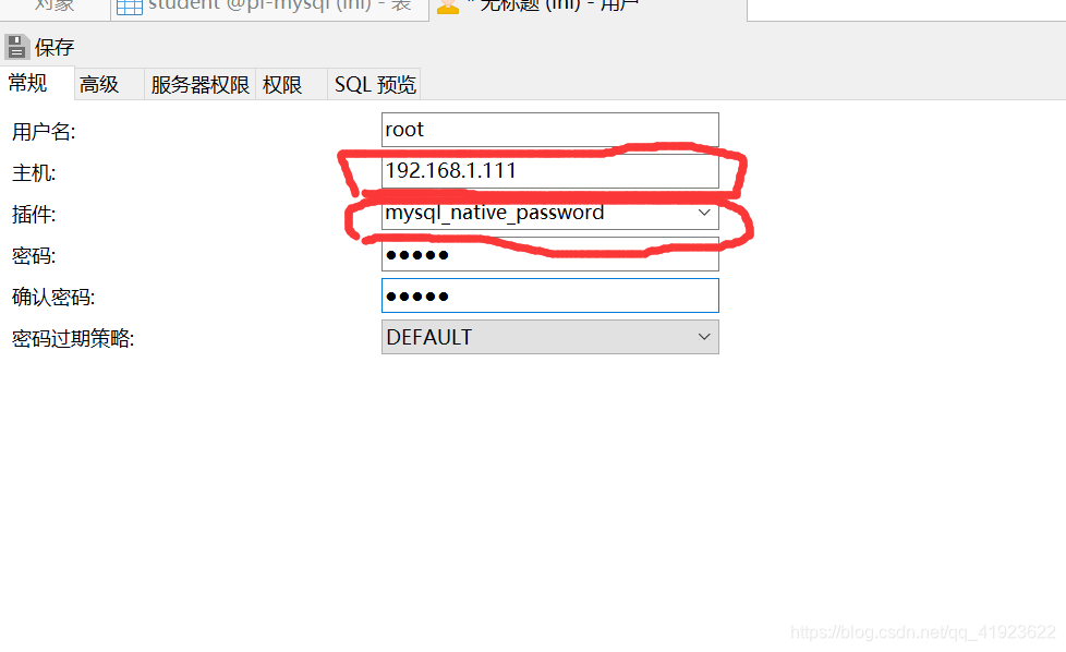 然后输入用户名 root 再输入访问的ID(我这里是树莓派的ip地址) 插件 选 mysql-native-password 密码 123456
