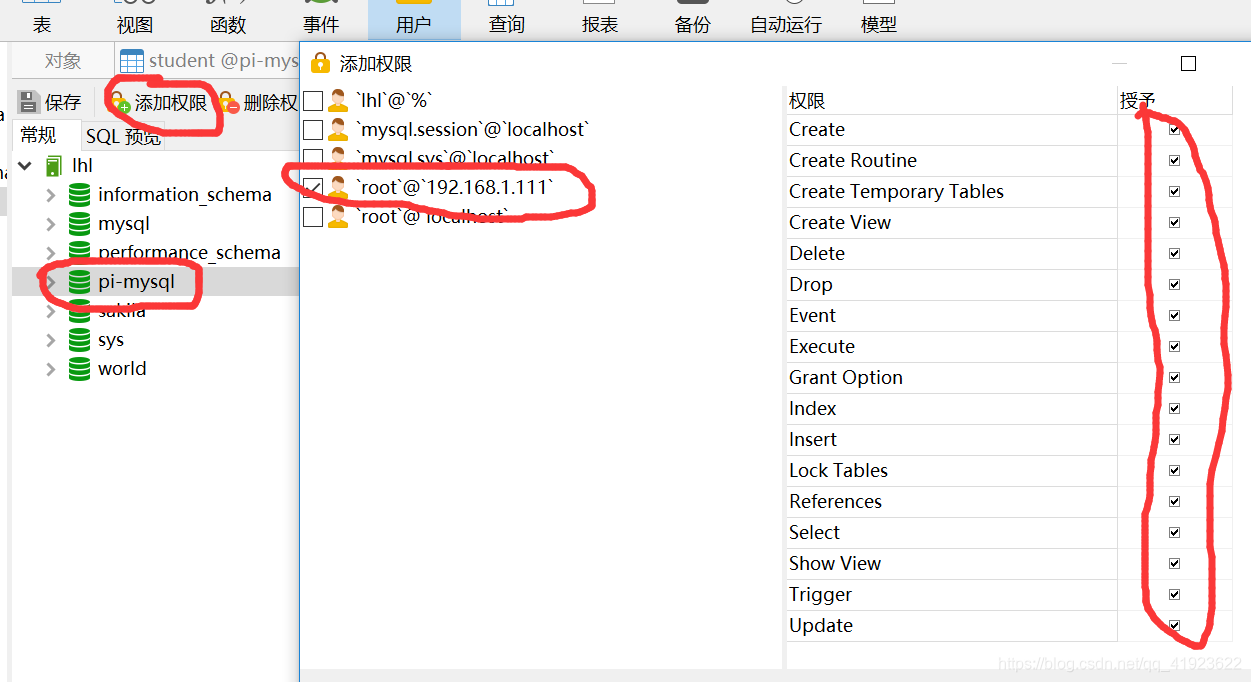 然后是 点击 需要交互的数据库名 再点击添加权限 把权限给 新添加的用户 权限 全部勾上好了 然后保存