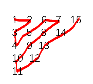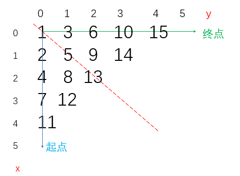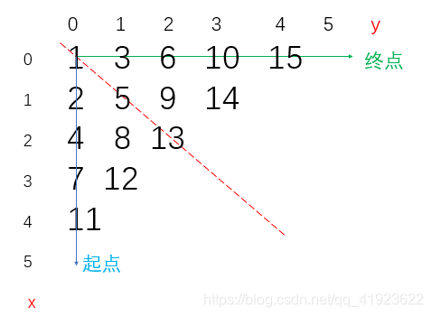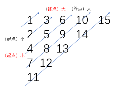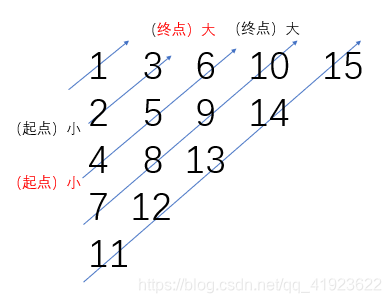 如图a 观察 可得 每一组斜线数据 从起点到终点 都是从小到大排列 因此我们只需要让上一个终点可以到下一个起点,就可以了,怎么找 加上坐标如图b 再看 所有的起点和终点关于 对角线对称所有的终点之间就差一个单位 (就是说 上一个终点(x,y) 和下一个终点(x,y++)差一个单位 y ++ 即可,而起点 和终点 关于对角线对称 所以终点(x,y) 他对应的起点则是(y,x))。这样 就让上一个终点通过关系 到下一个起点了。