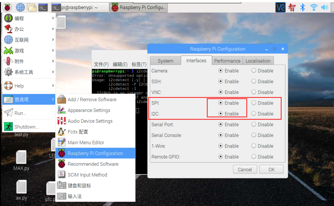 选择8 Advanced Options,打开SPI和I2C,然后会提示重启。重启完之后。
