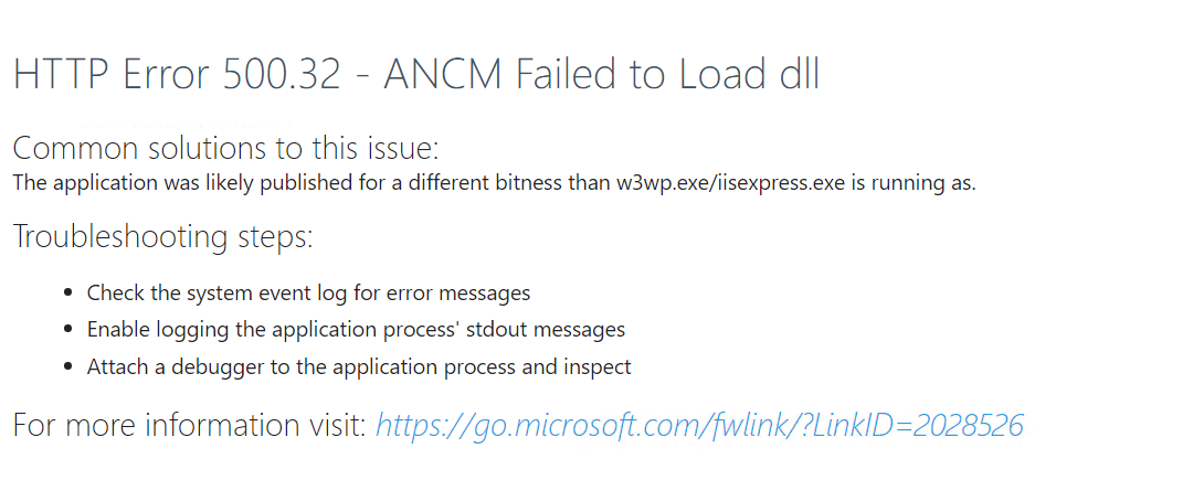 在测试环境部署已经有多个.Net Core项目都可以正常运行。今天新部署Skoruba.IdentityServer4.Admin-2.0.1项目到IIS,部署还是往常的操作方式,部署完成打开浏览器访问地址时候,就奇葩出现Http 500.32错误码......真是一万个草泥马。