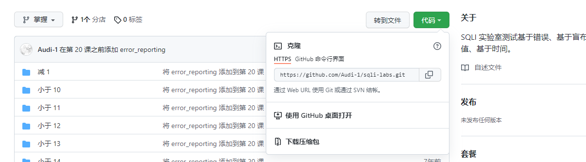 下载sqli-labs靶场 项目地址:https://github.com/Audi-1/sqli-labs