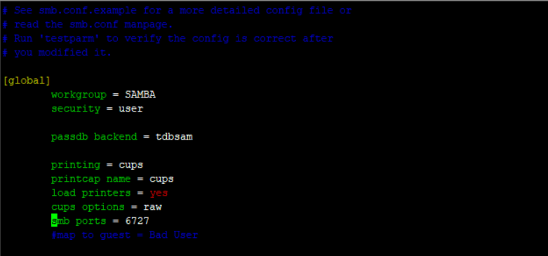 既然要使用其它端口,意味着我们服务的端口就不能再是 445,所以我们修改 Samba 主配置文件: