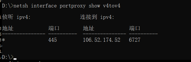 运行以下命令:netsh interface portproxy add v4tov4 listenport=445 connectaddress=xxx.xx.xxx.xx connectport=6727运行后什么都不会显示的