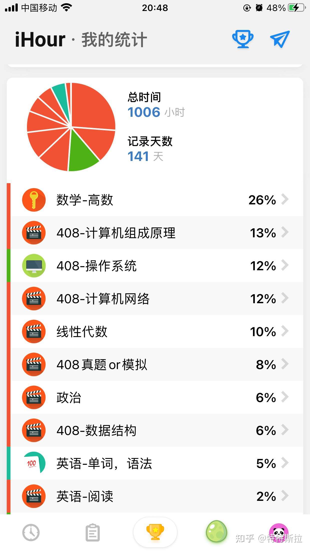 可以看出,最后140天,我51%的时间花在了408,大概500小时出头,36%的时间花在了数学,英语政治加起来13%, 总有效复习时间按1500+小时去准备把(大概8,9个月),这样可以充裕一点,舒服一点。