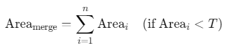 使用8邻域连通性标记区域,合并面积小于阈值的孤立区域。