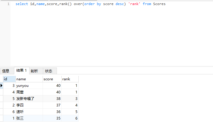 作用:查出指定条件后的进行排名,条件相同排名相同,排名间断不连续。