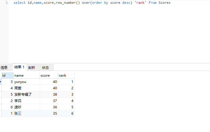作用:查出指定条件后的进行排名,条件相同排名也不相同,排名间断不连续。 说明:这个函数不需要考虑是否并列,即使根据条件查询出来的数值相同也会进行连续排序。 如图