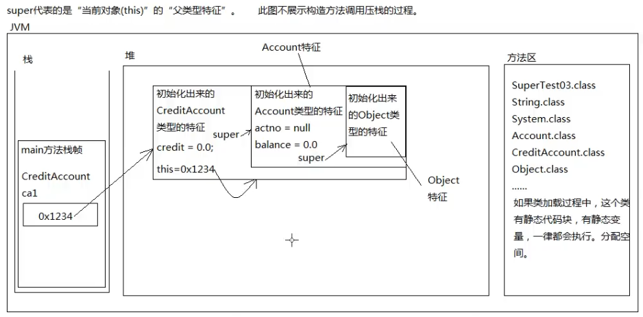 - super()或super(实参)只能出现在构造方法的第一行,通过当前走早方法区调用“父类”中的其他构造方法,目的是:创建子类对象的时候,先初始化父类特征。
