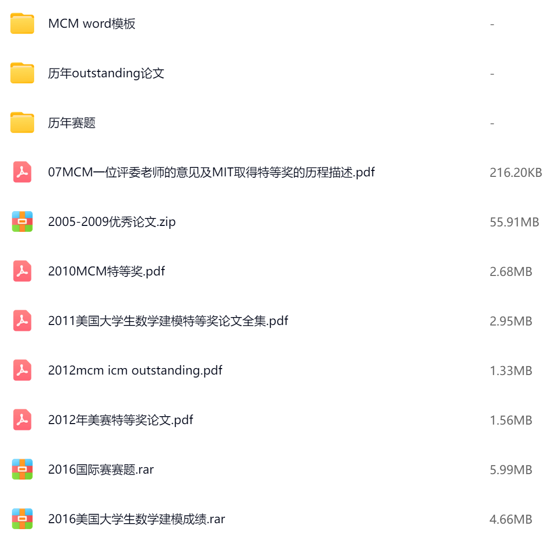 本文介绍并分享自己当初准备数学建模比赛时,收集的所有资料,包括历年赛题与论文、排版模板、算法讲解课程与书籍、评分标准、数学建模软件等各类资料。