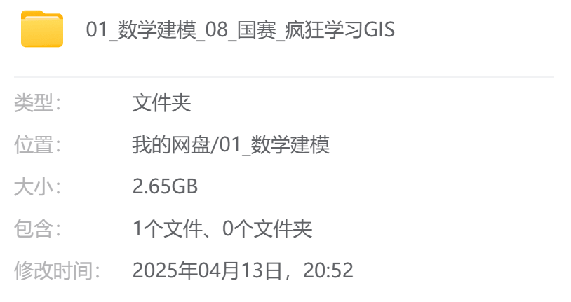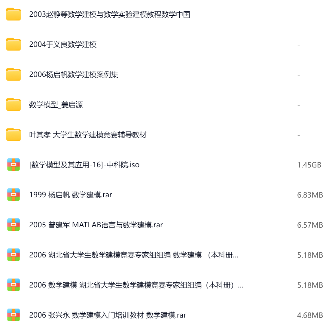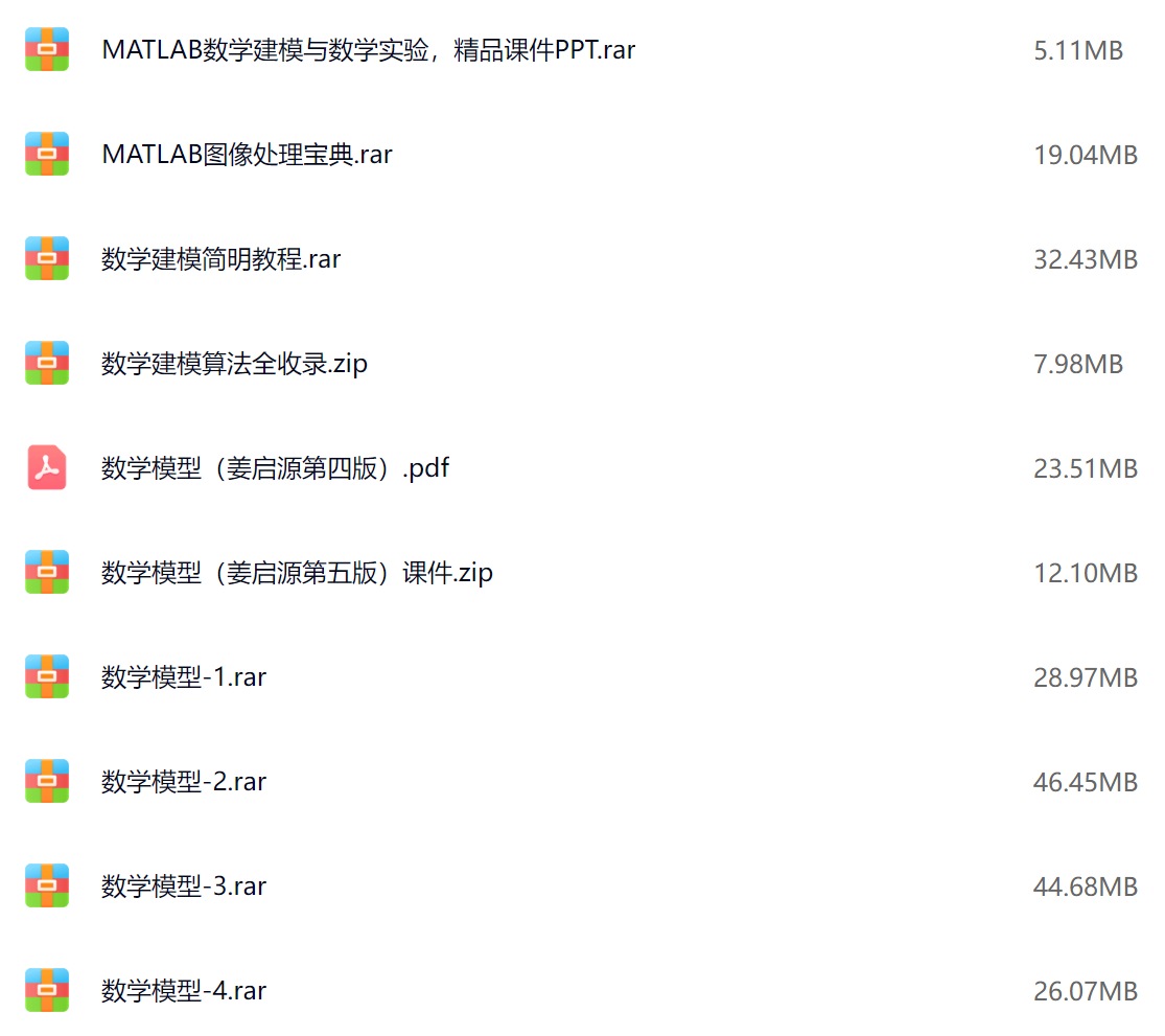 本文是这个系列的第一篇文章,将与数学建模相关的资源加以分享。其中,本文共有9个资源,以下是对每一个资源的具体介绍。每一个资源都控制了文件个数(小于500个),从而方便大家转存。本文的每一个小标题,都是资源的名称;因为本文是系列文章中的第一篇,且分享的是数学建模相关内容,所以每一个资源的名称开头都带了01_数学建模这样的前缀。