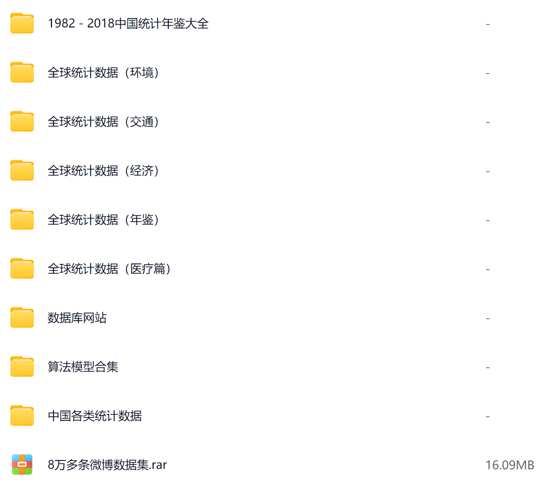 这一资源为与数学建模相关的统计数据资源,涵盖美赛、亚太赛、国赛等各类数学建模赛事,包括中国历年统计年鉴、全球分行业统计数据、数据库网站、社交软件数据集等。