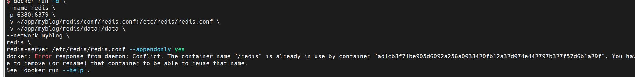 这里报错,原因是我之前有redis的容器,同名了(如果容器过多,可以用项目名加redis来命名容器)