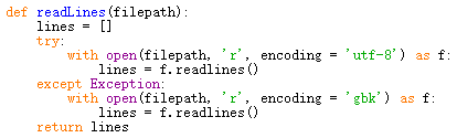 该函数用于读取路径为filepath的文本内容,其中包含了函数f.readlines(),该函数作用为:读取文本所有行,结果保留在一个列表变量中,每行作为一个元素。