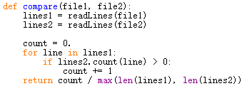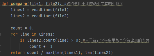 该函数用于比较两个文本的相似度,其中用到了函数count(),通过它可以知道文本二的每一行内容是否能在文本一中找到相似部分。