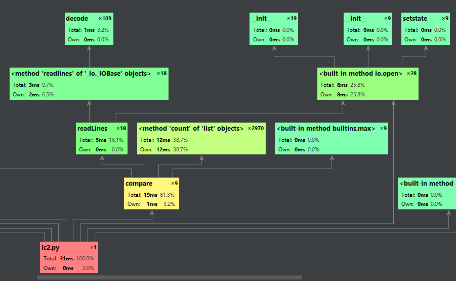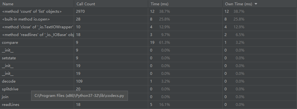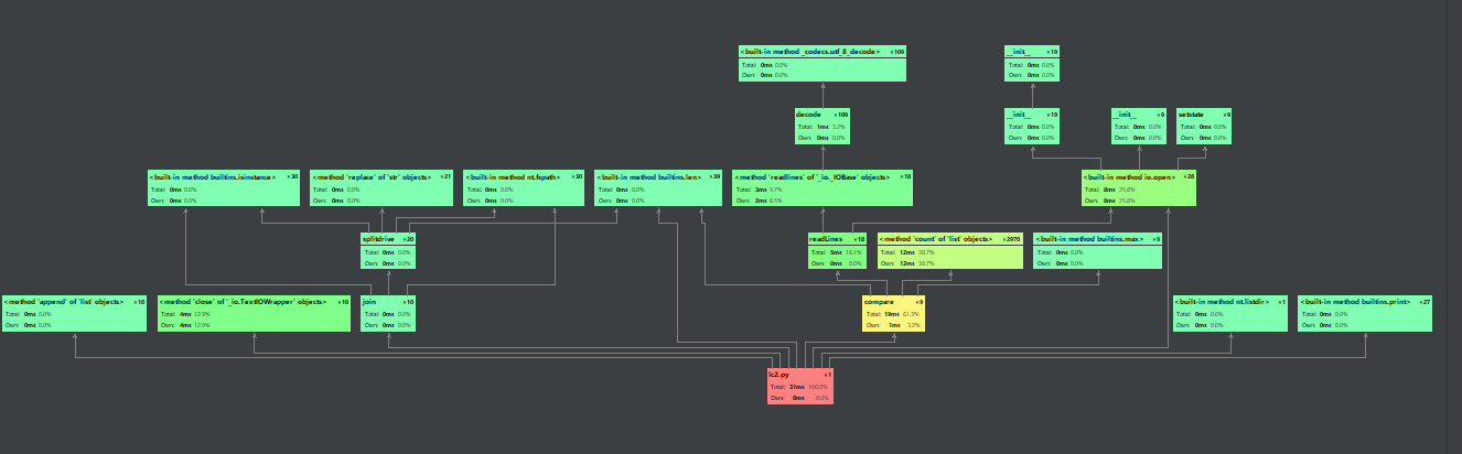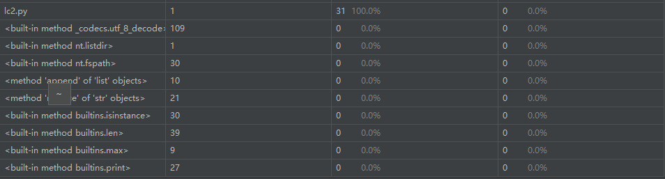 因为我是用IDLE进行代码的一个编写,我就直接用IDLE的性能分析工具进行性能测试,在代码中加入“cProfile.run('foo()', 'foo.out')”,然后在代码目录下运行cmd,输入命令“python -m cProfile del.py”,就会出现相关的一些性能分析。但后面发现可能pc自带的profile性能测试工具会比较好用一些,所以这里我就贴上用pc的性能测试工具测试出的性能分析。