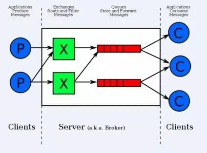 中间即是 RabbitMQ,其中包括了 交换机 和 队列。