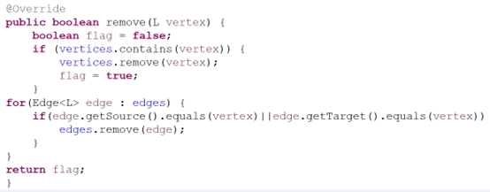 public boolean remove(L vertex) { boolean flag = false; if (vertices.contains(vertex)) { vertices.remove(vertex); flag = true; } for(Iterator<Edge<L>> edg = edges.iterator();edg.hasNext();) { Edge<L> edge = edg.next(); if(edge.getSource().equals(vertex)||edge.getTarget().equals(vertex)) { edg.remove(); } }