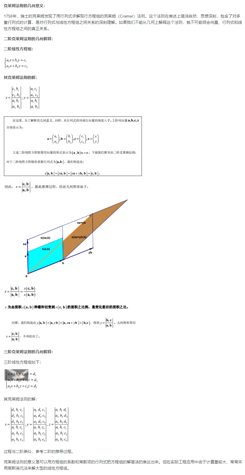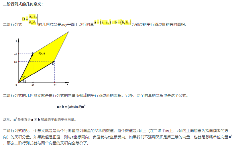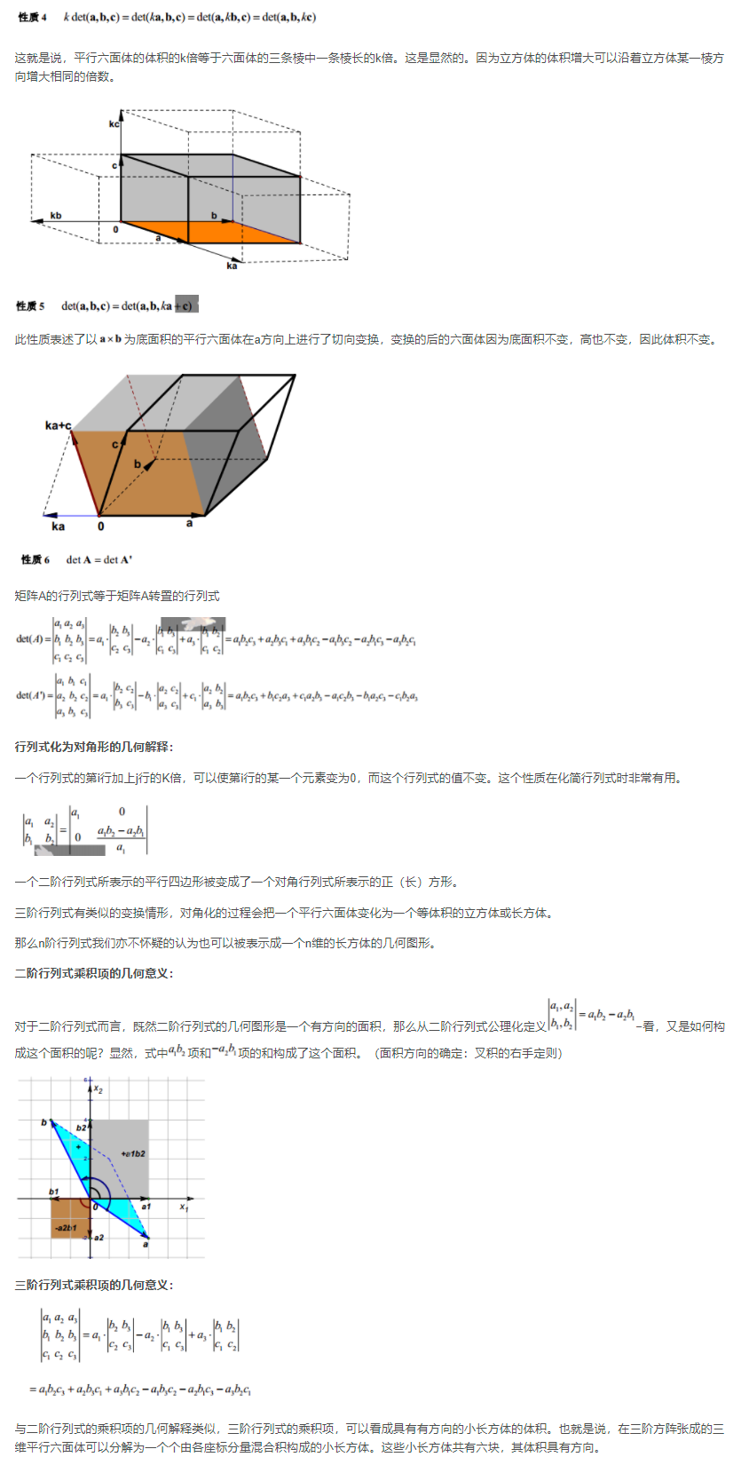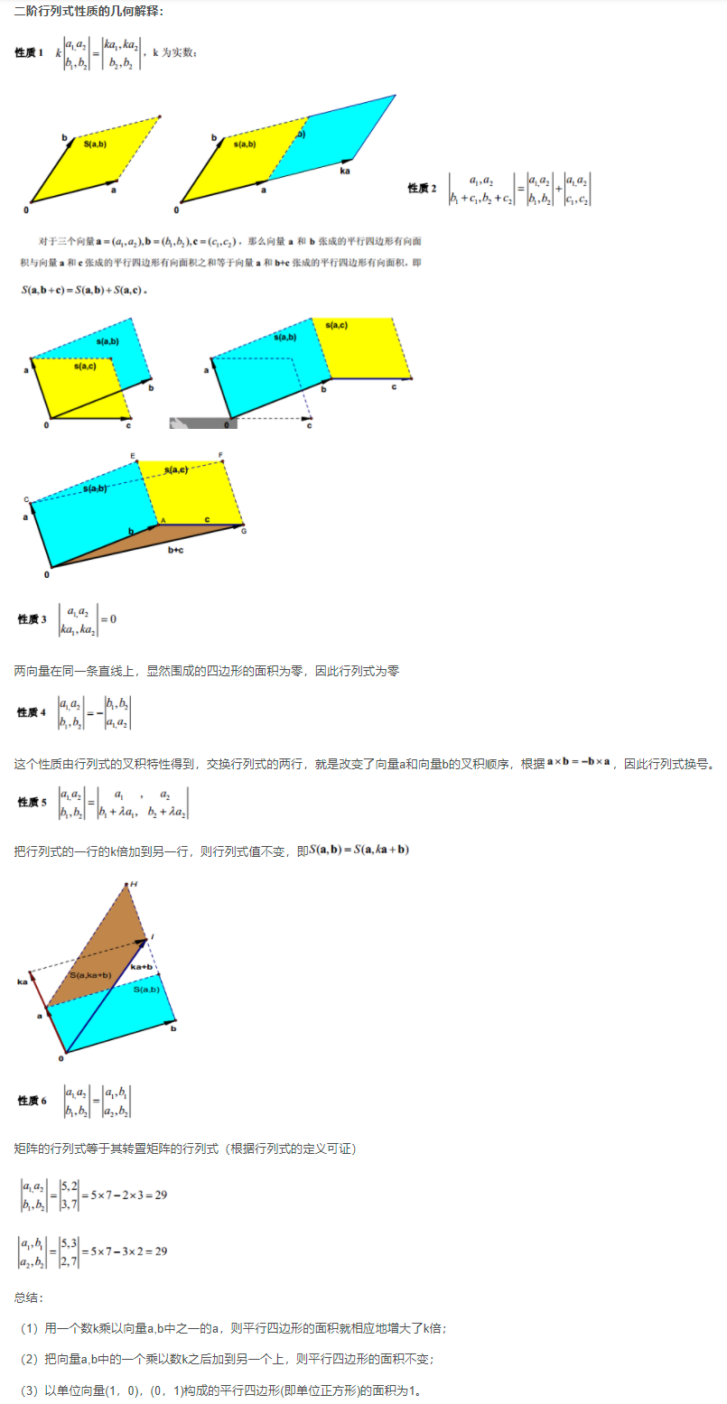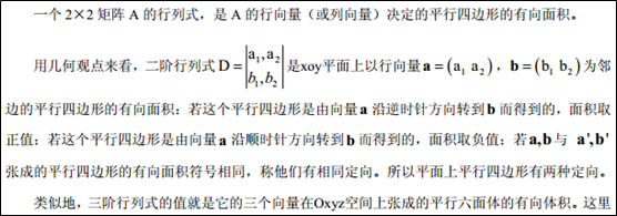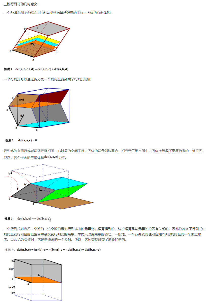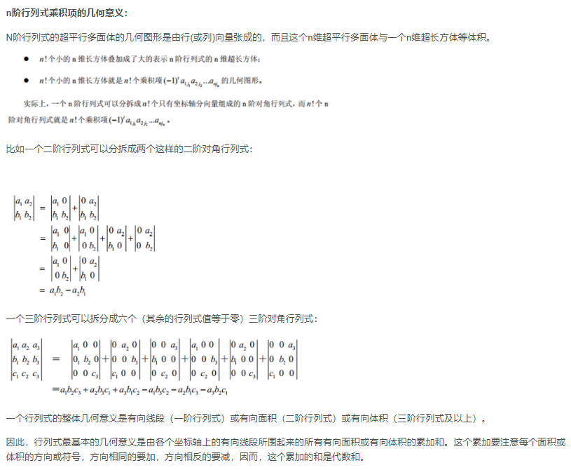 一个解释是行列式就是行列式中的行或列向量所构成的超平行多面体的有向面积或有向体积;