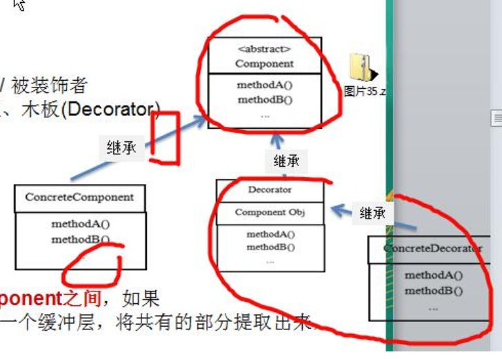 在如图的Component与ConcreteComponent之间,如果ConcreteComponent类很多,还可以设计一个缓冲层,将共有的部分提取出来,抽象层一个类。