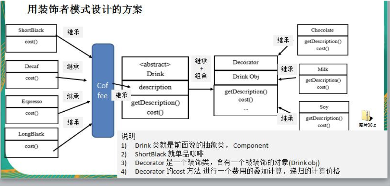 - Decaf就是单品咖啡,继承Drink,并实现cost