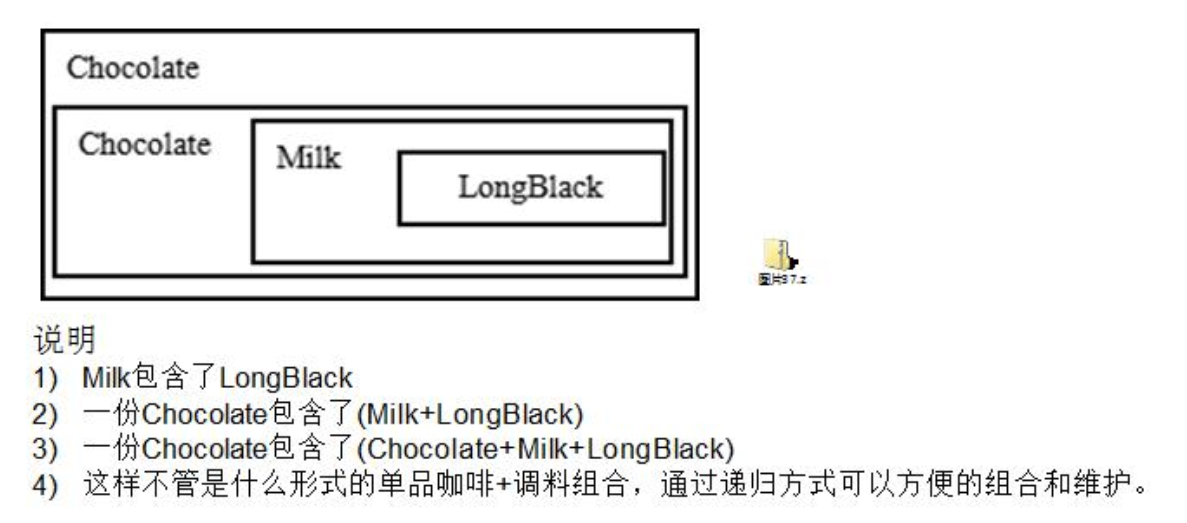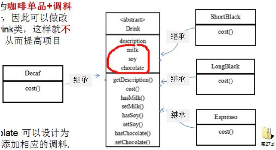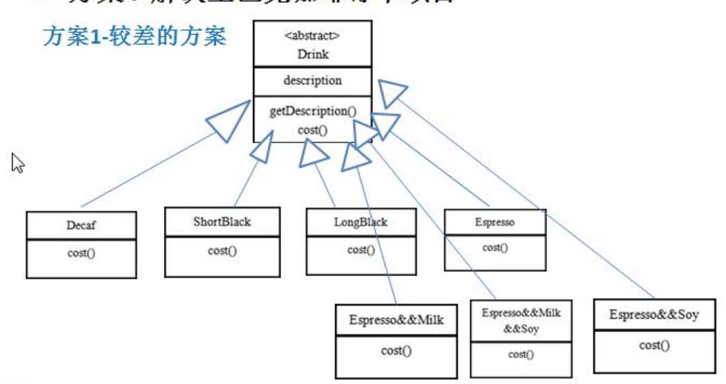 - 问题:这样设计,会有很多类,当我们增加一个单品咖啡,或者一个新的调料,类的数量就会倍增,就会出现类爆炸