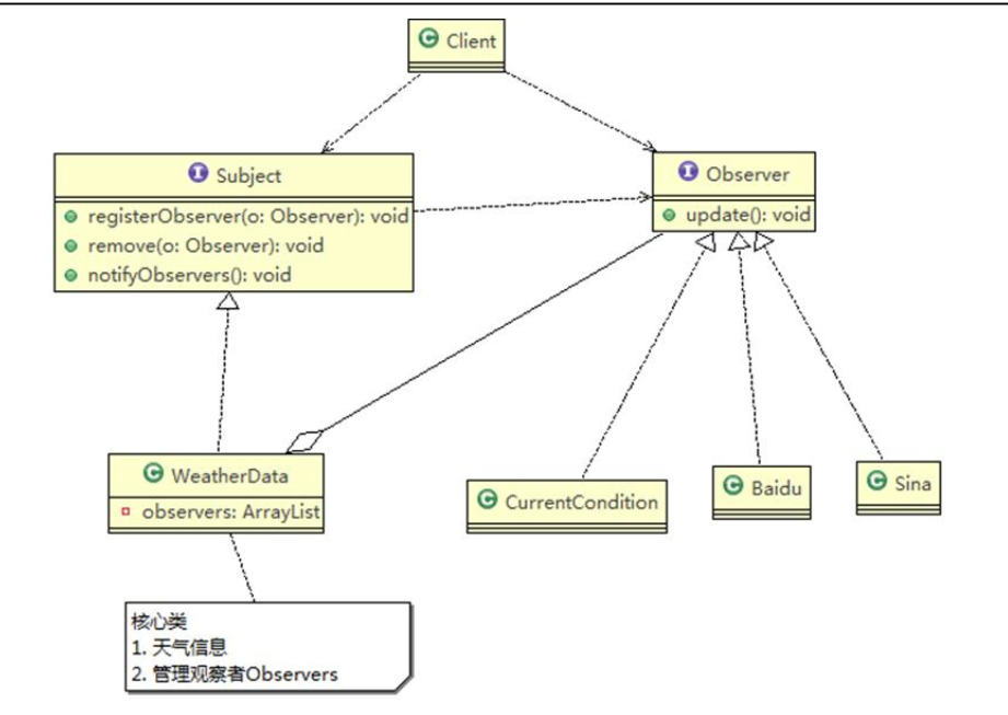 - 观察者模式设计后,会以集合的方式来管理用户(Observer),包括注册,移除和通知。
