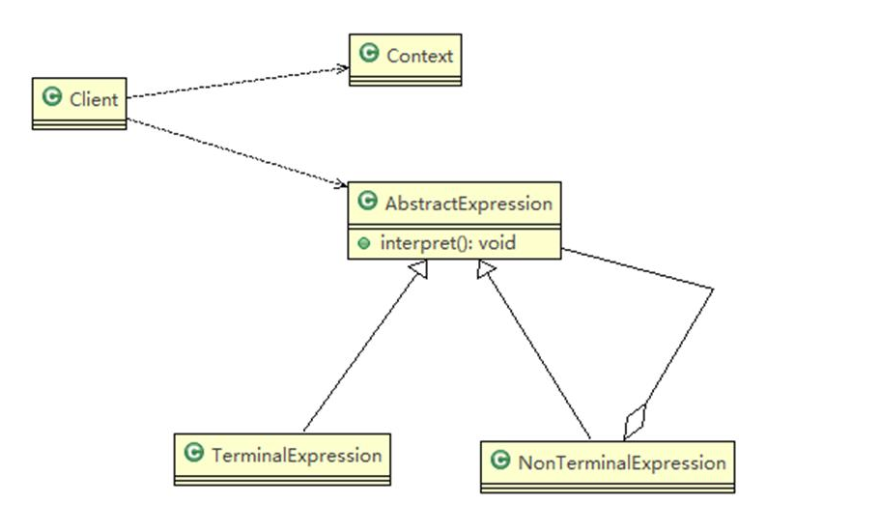 4)NonTermialExpression:为非终结符表达式,为文法中的非终结符实现解释操作.
