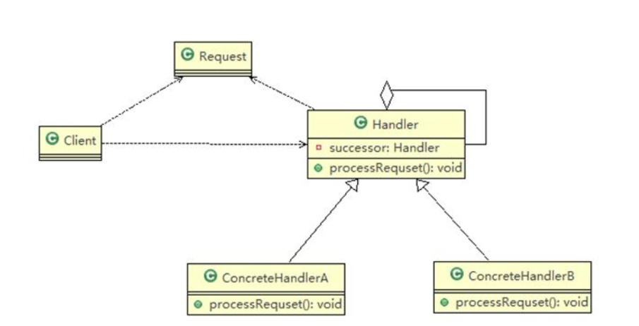 2)ConcreteHandlerA,B是具体的处理者,处理它自己负责的请求,可以访问它的后继者(即下一个处理者),如果可以处理当前请求,则处理,否则就将该请求交个后继者去处理,从而形成一个职责链