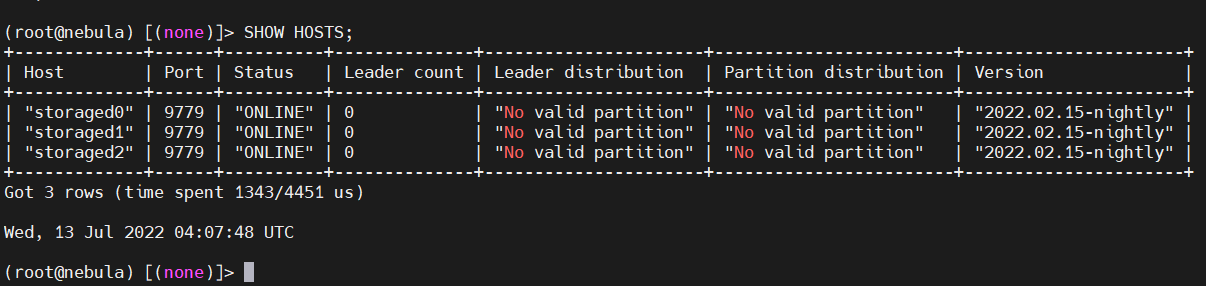 此时Nebula Graph就已经安装好了,单是还不能创建空间,从 3.0 开始,上报到 metad 的 nebula-storaged 服务需要人为 ADD HOSTS 之后才可以被使用。