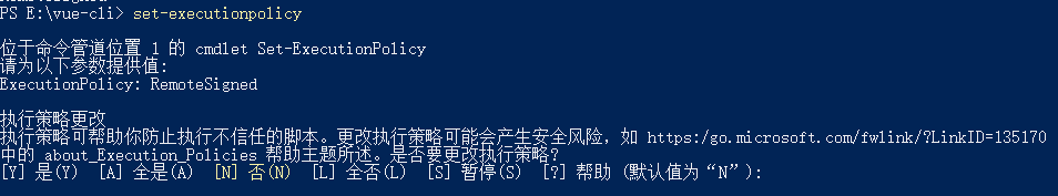 2.设置executionpolicy,命令行运行set-executionpolicy出现如下,在冒号后设置值为 RemoteSigned 回车