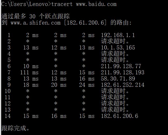 这里使用tracert命令对www.baidu.com在Windows系统下测试。最左侧1-14表示每经过一个路由TTL+1,中间三列表示三次发送的ICMP包返回时间,最右是途经路由的IP地址。