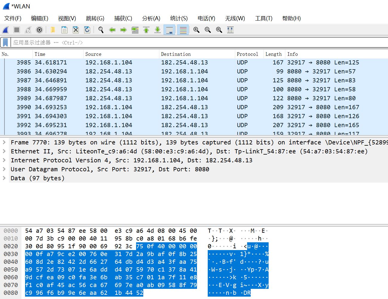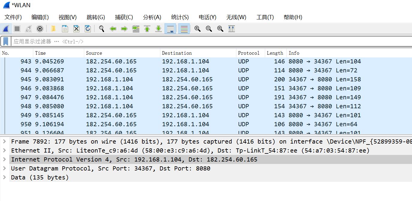 - 使用wireshark进行抓包,通过微信语音建立连接(UDP),查看好友ip地址,选择WLAN进入,自动开始抓包