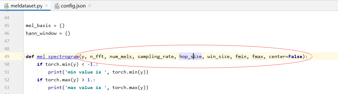 3.在config.json中对训练参数进行配置,重点关注对输入频谱的处理函数传入参数