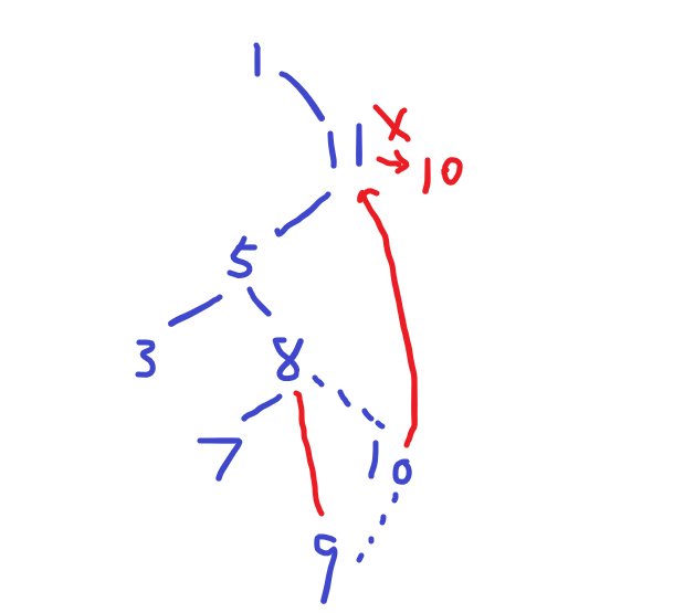 **前驱替换法** 用被删除节点左子树最右边的节点的值来替换被删除节点  上图删除了节点11
