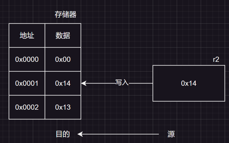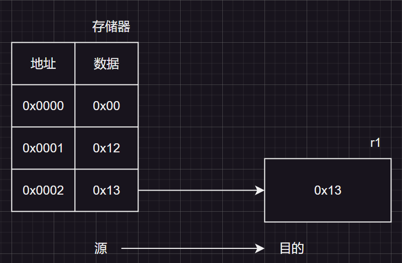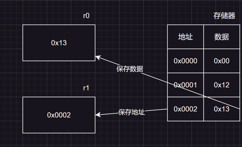 例如:r0寄存器保存了存储器地址为0x0002存储单元中的数据0x13,r1寄存器保存了存储器的数据单元的地址0x0002(即指针)。