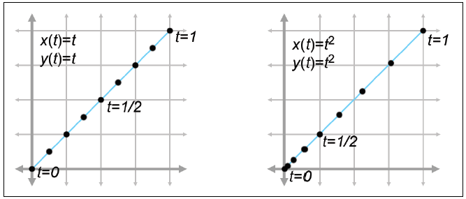 注意下图两条曲线定义了相同的静态形状,但是运动路径不同,左边的粒子以恒定的速度运动,右边的粒子一开始运动很慢,但随着$t$的增加它加速到终点。