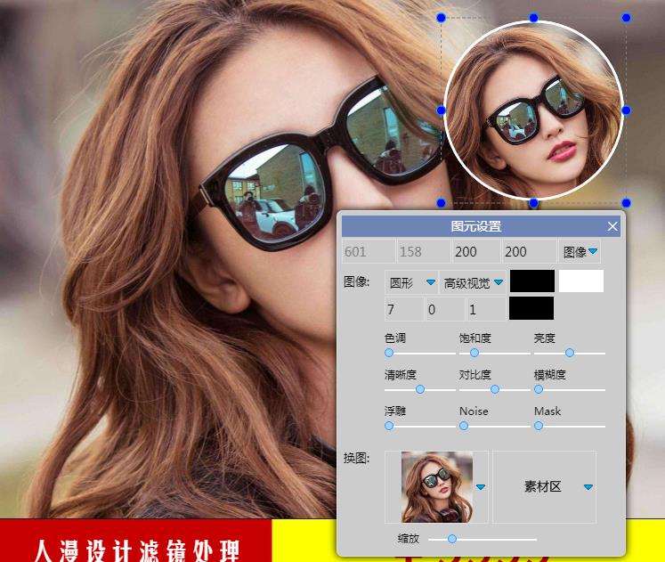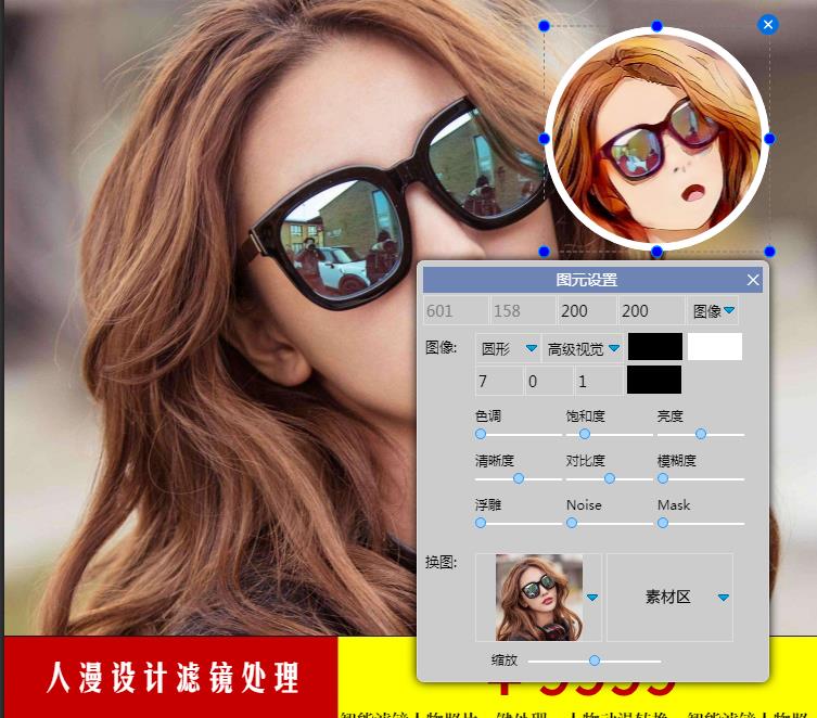 在本例中,我们把图元设成圆形,边框白色,选择美女图,缩放美女图等操作,最后关键的一步,在“高级视觉”中选择“二次元”,