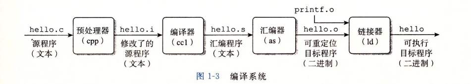 以linux gcc编译器为例,可分为四个阶段,执行这四个阶段的程序(预处理器、编译器、汇编器和链接器)一起构成了编译系统。