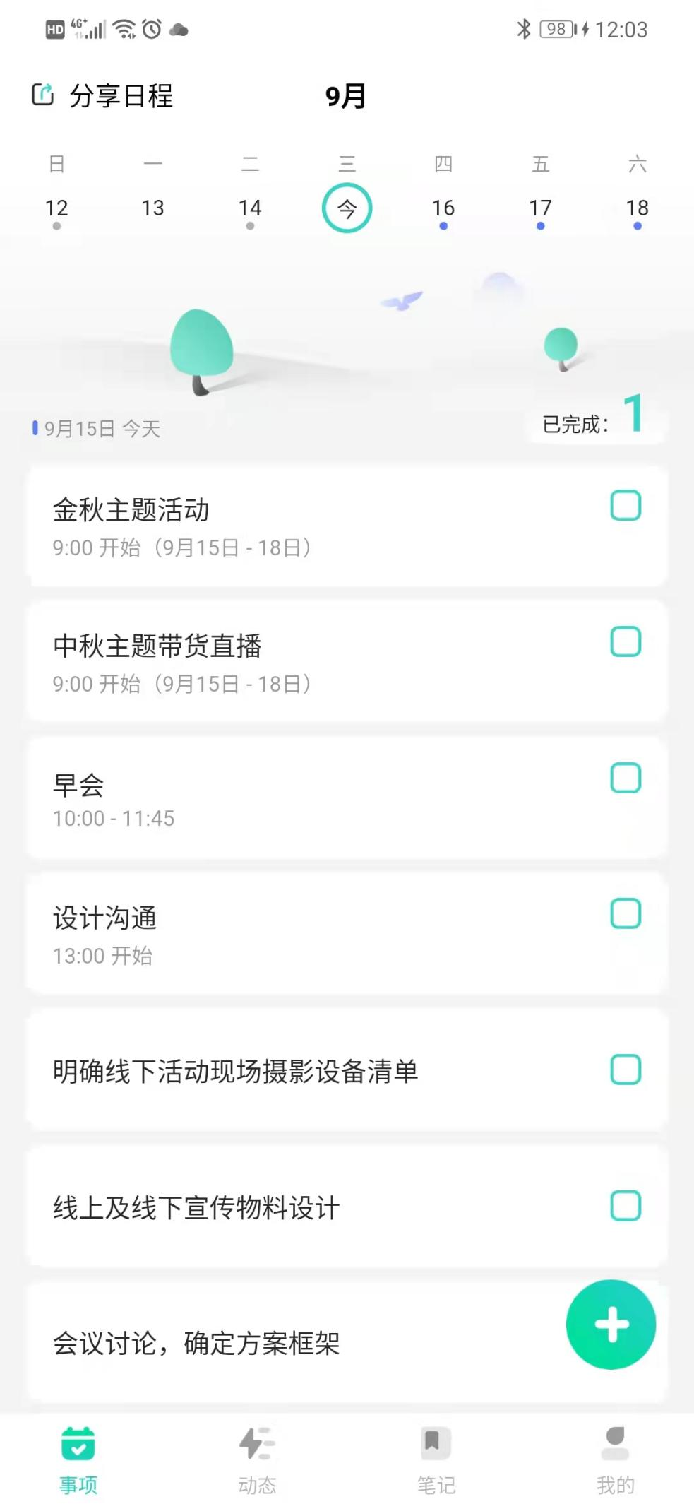 并且,这个界面也起到了很好的整合管理效果,在我们将某项计划完成时,便可在对应的计划后面进行勾选,如下图所示,被勾选的计划则不会再出现于“事项”界面中,而会出现于“已完成”界面中。