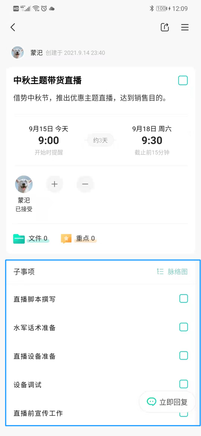 此外,针对“责任人”,当计划发起人确定计划子事项责任人后,该计划子事项将直接呈现在对应责任人的界面之中,如此一来,通过飞项,我们便可将这种高效及有条理的计划管理分享给每一个人。