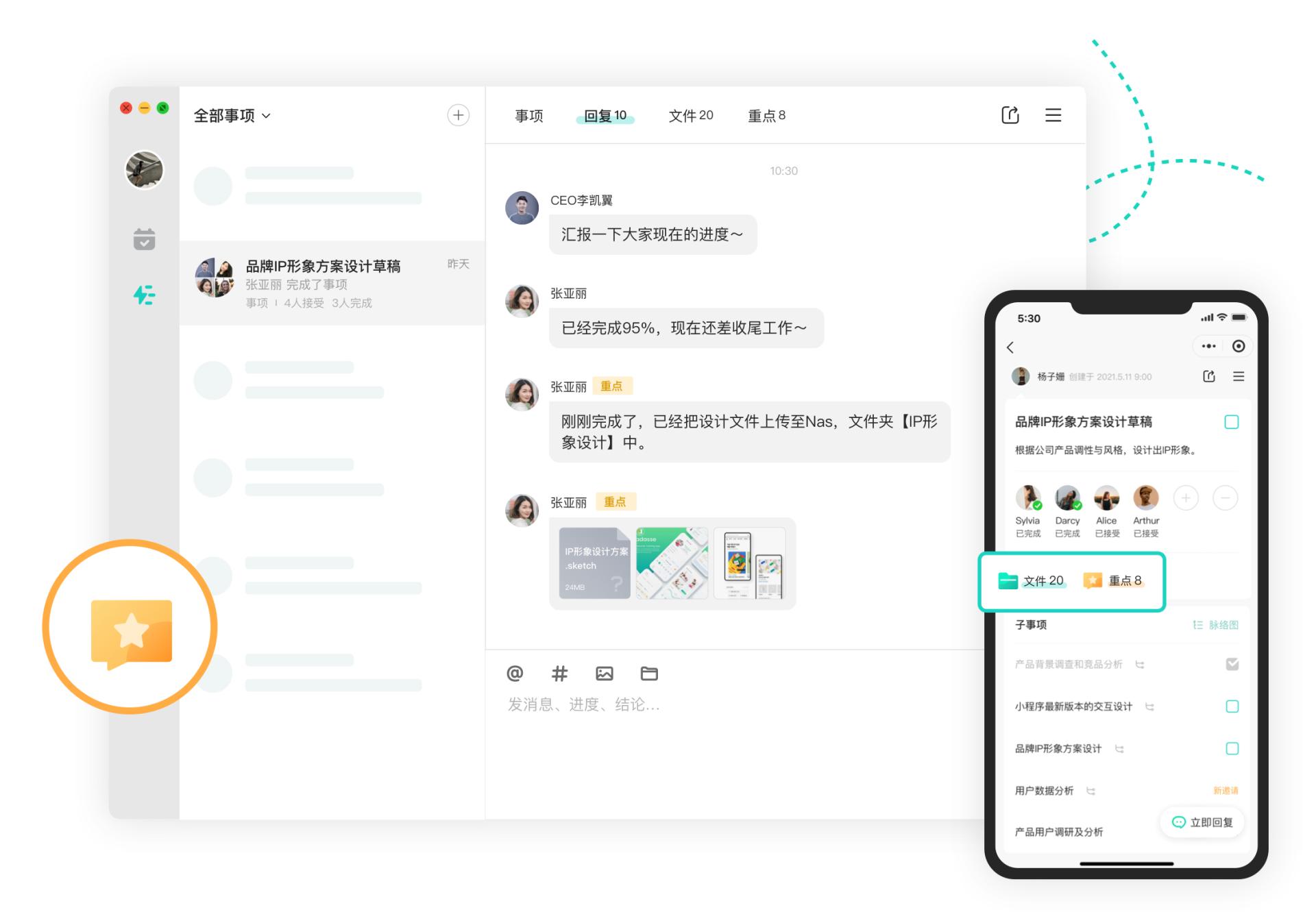 在沟通过程中,对于重要信息可以直接划重点,并有专区可直接查看,保证信息准确传达。同时还有发起会议、创建待办和发布公告等小工具,大大节省了沟通效率。