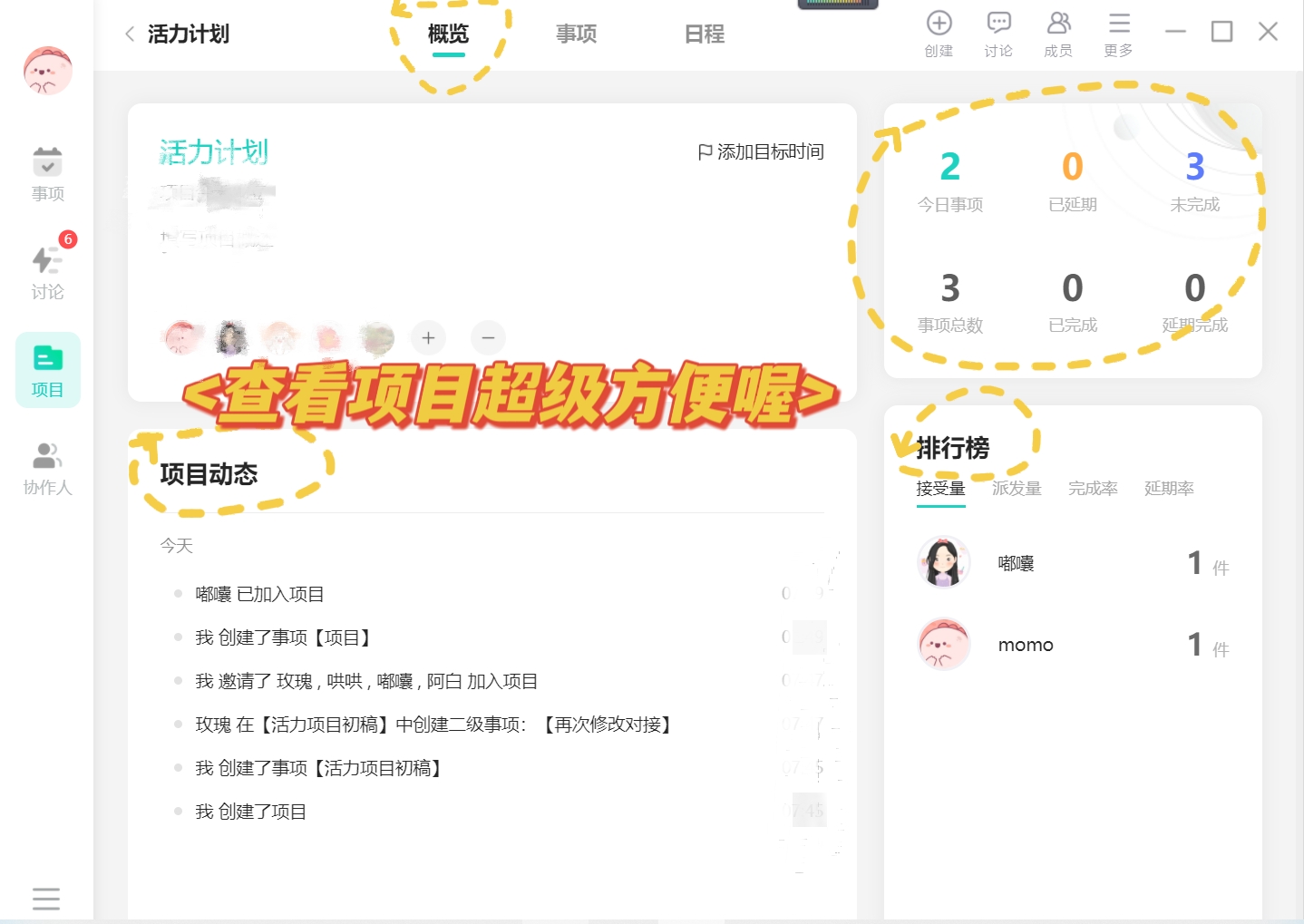 在飞项里面,创建好的项目,可以直接点击项目概览,查看与项目有关的信息,比如说背景信息、协作成员、动态进展等等。这个里面的排行榜功能也很赞,能够看到哪些人做事比较积极,以后升职加薪也有依据。
