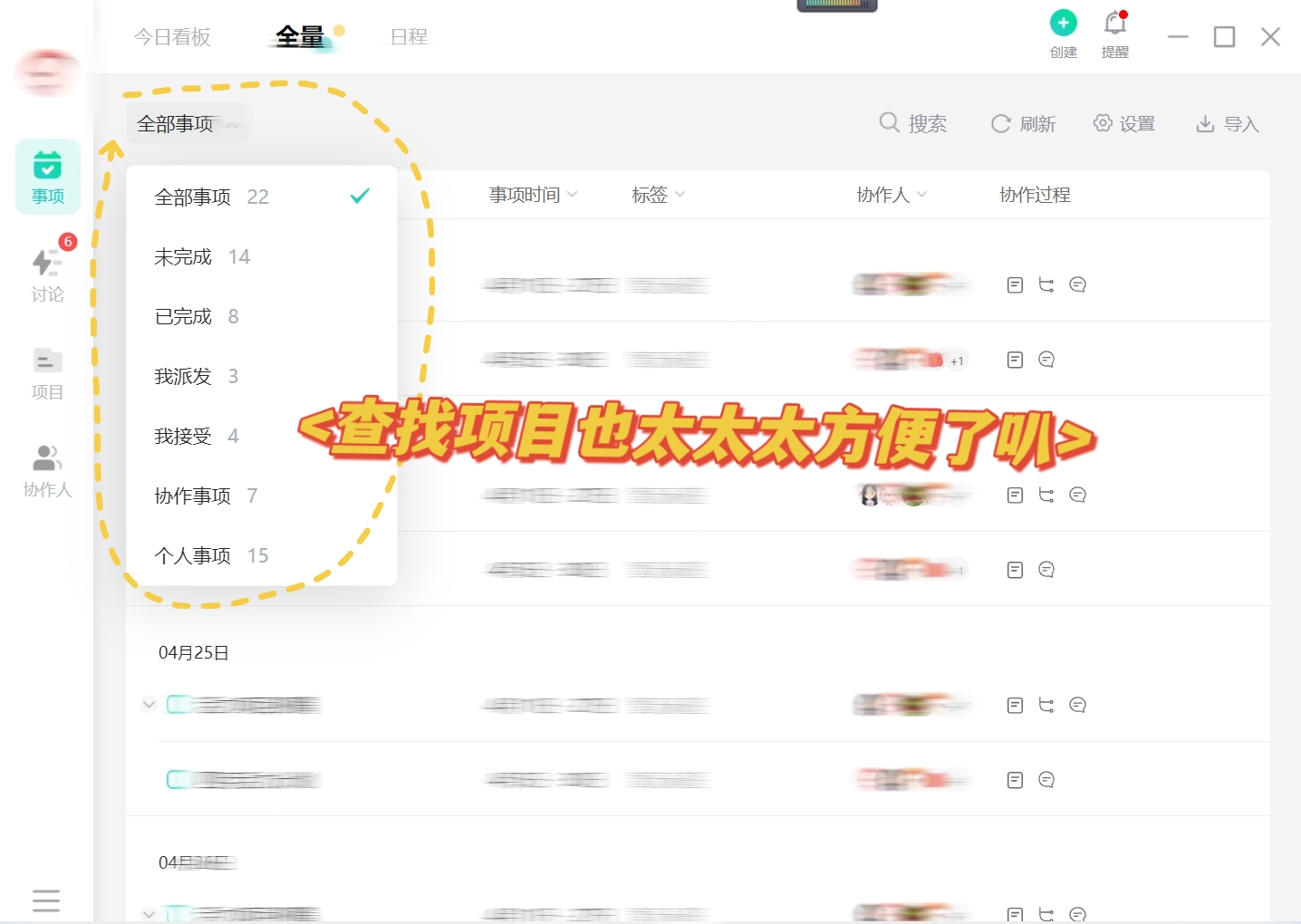 管理项目也是一件让很多人头疼的事情,但是在飞项里面,管理项目就能变成一件很轻松的事。我们可以点击“事项列表”,然后分别根据“时间”、“协作人”、“完成状态”等来查找项目。
