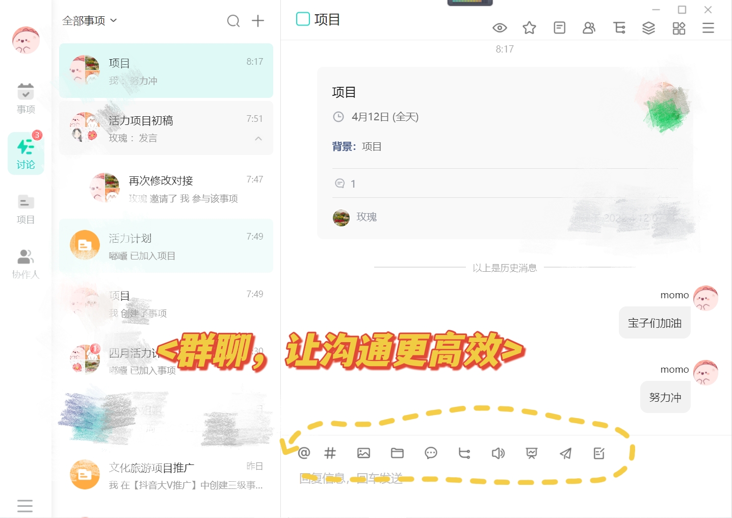 在飞项里面,每一个项目都能进行实时沟通,每一个项目都有专属群聊。在专属群聊里面可以发布事项、创建待办、预约会议、标记重点等等。我超喜欢这些小功能,我觉得使用这些功能能让沟通更高效,能够更加节约时间成本。