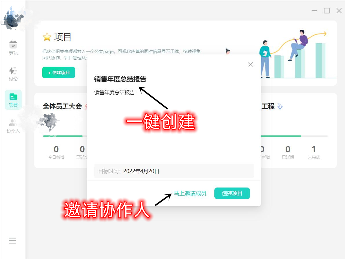 遇到各种各样的项目任务的时候,如果使用传统的手写方式进行记录难免会受到非常多的因素影响,诸如时间规划麻烦、容易丢失、破损无法找回等等,但是这时候飞项的一键创建项目功能便可以完全解决这个问题,创建项目的同时还可以对项目的开始和结束时间进行设置,甚至可以根据不同的项目要求增加相对应的负责人,可以说是非常的贴心。