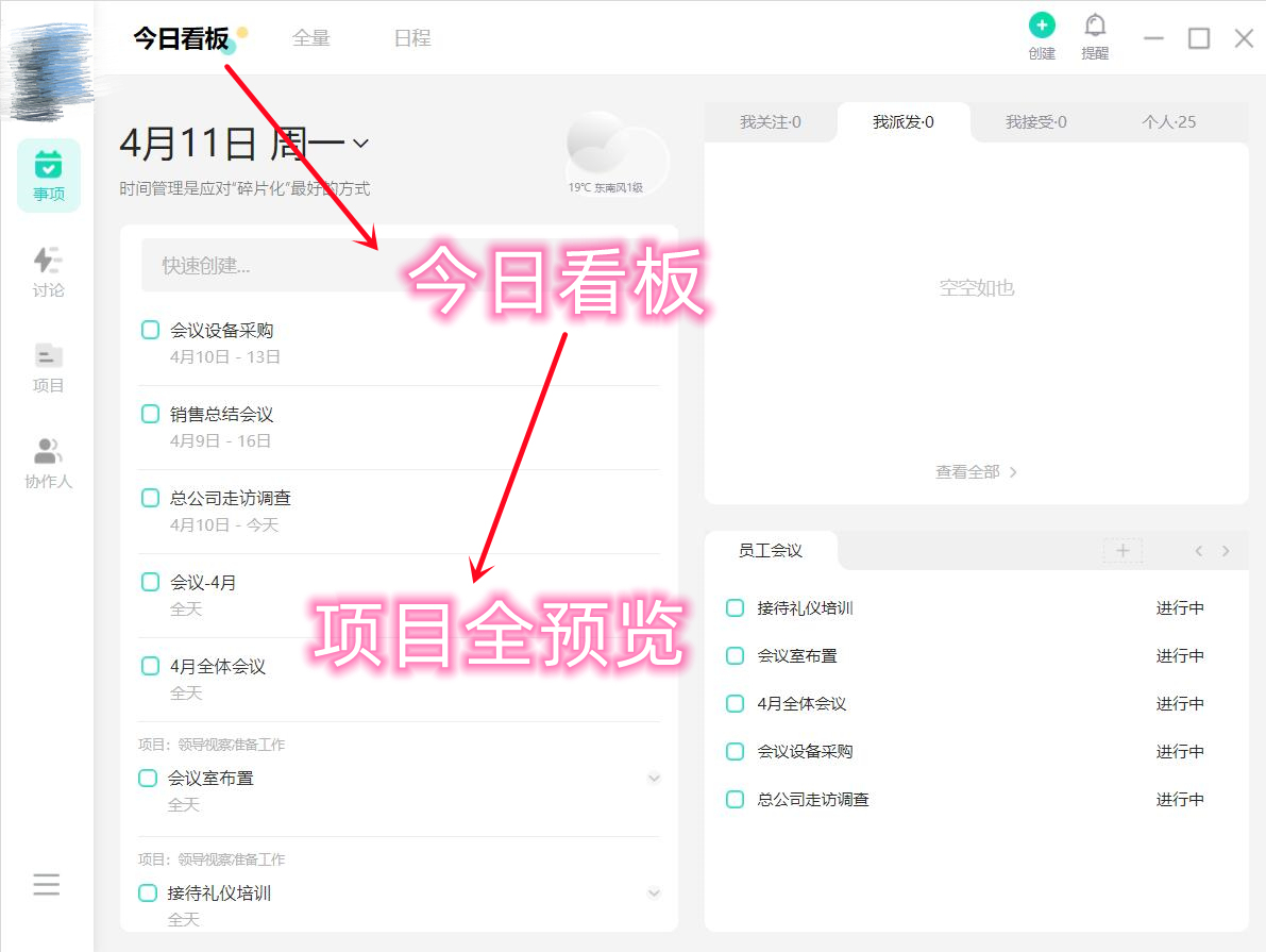 飞项的今日看板以最简单明了的格式展现出今日的项目任务及详情,看板不仅会显示个人所创建的项目,别人派发给自己的项目也会显示。这样一个简单的界面便成功避免了个人因对自己日常工作不了解,以及对项目优先级不清楚,所造成的工作上的疏漏。